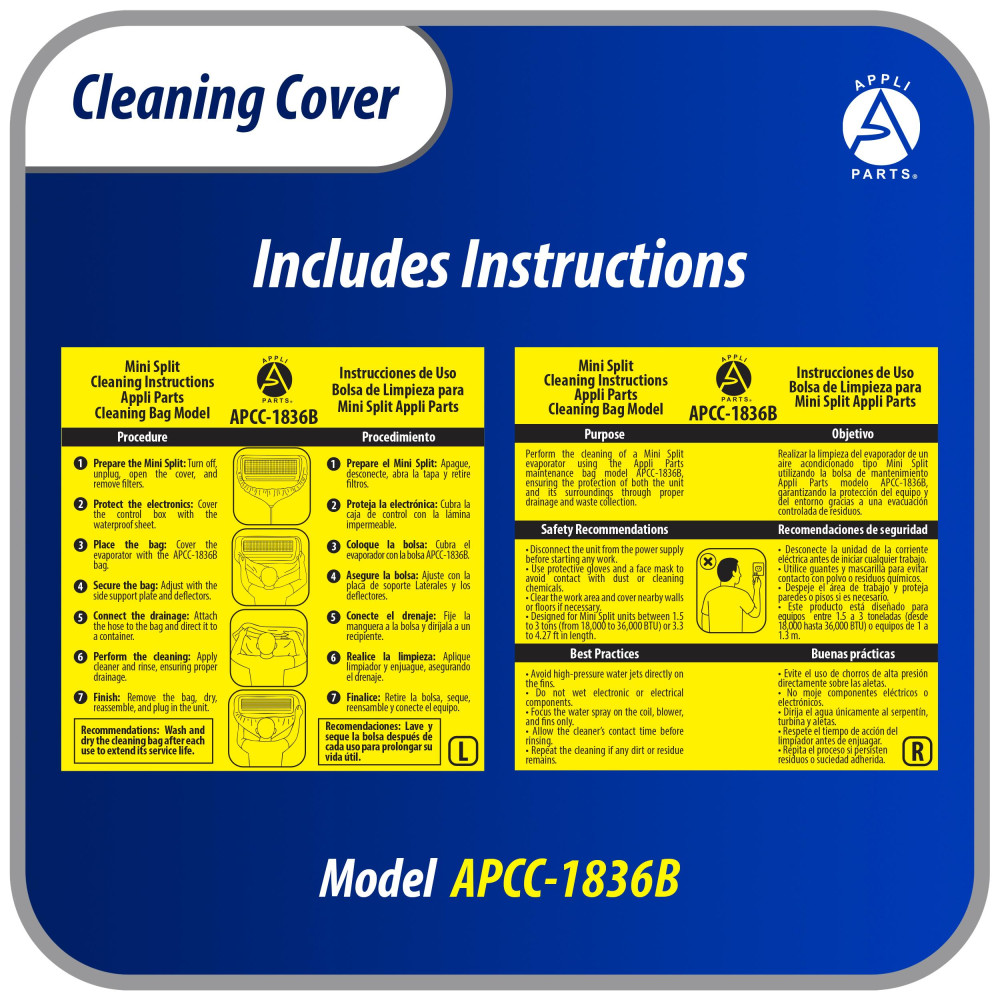 Appli Parts APCC-1836B Cleaning Cover Kit or Maintenance for Mini Split 1.5 - 3 Tons (from 18,000 to 36,000 Btu), 3.3 to 4.27 ft in length, Waterproof, 3 yd Drain Hose, with Support Plate.