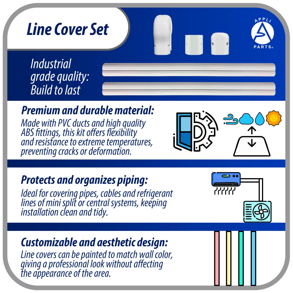- Quick and complete installation: 3 in x 7.48 ft line cover kit includes 2 straight ducts, 1 coupling, 1 end cap, 1 wall cover and screws for easy installation.