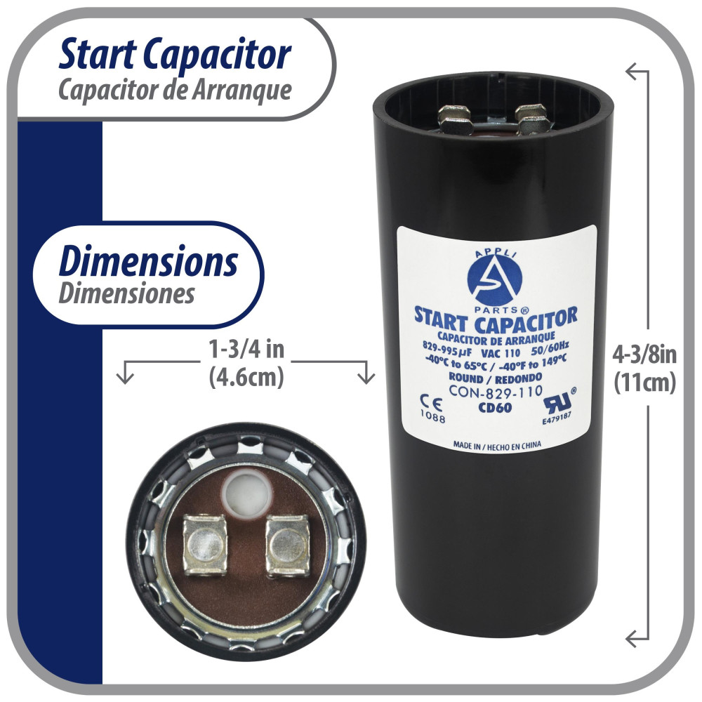 Appli Parts CON-829-110 Motor Start Capacitor 829-995 MFD uF, 110-125 VAC. Universal for Electric Motor Applications, 1.75 in Wide, 4.38 in Height