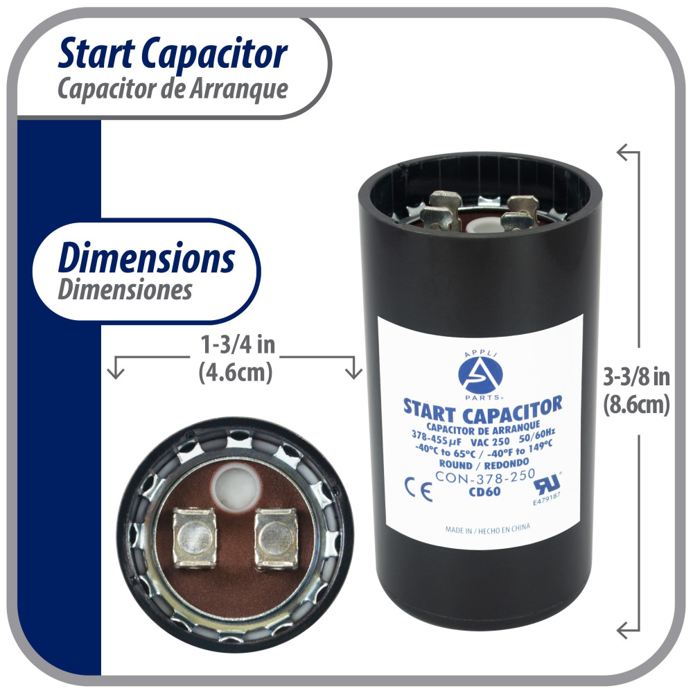 Appli Parts CON-378-250 Motor Start Capacitor 378-455 MFD uF, 250 VAC. Universal for Electric Motor Applications, 1.75 in Wide, 3.38 in Height