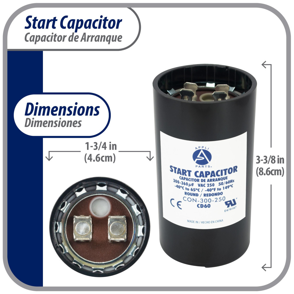 Appli Parts CON-300-250 Motor Start Capacitor 300-360 MFD uF, 250 VAC. Universal for Electric Motor Applications, 1.75 in Wide, 3.38 in Height