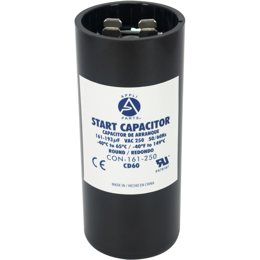 Appli Parts motor start capacitor 161-193 Mfd (microfarads) uF 250 VAC universal fit for electric motor applications 1-7/16 in Wide 3-3/8 in Height CON-161-250