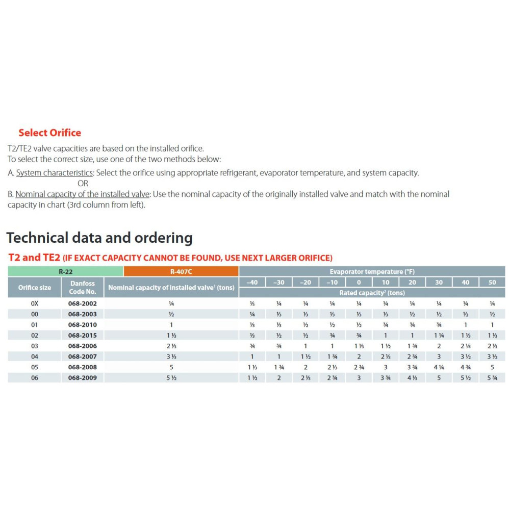 - Capacity: 0.15 to 4.5 tons (1.8 to 15.8 kW), depending on orifice