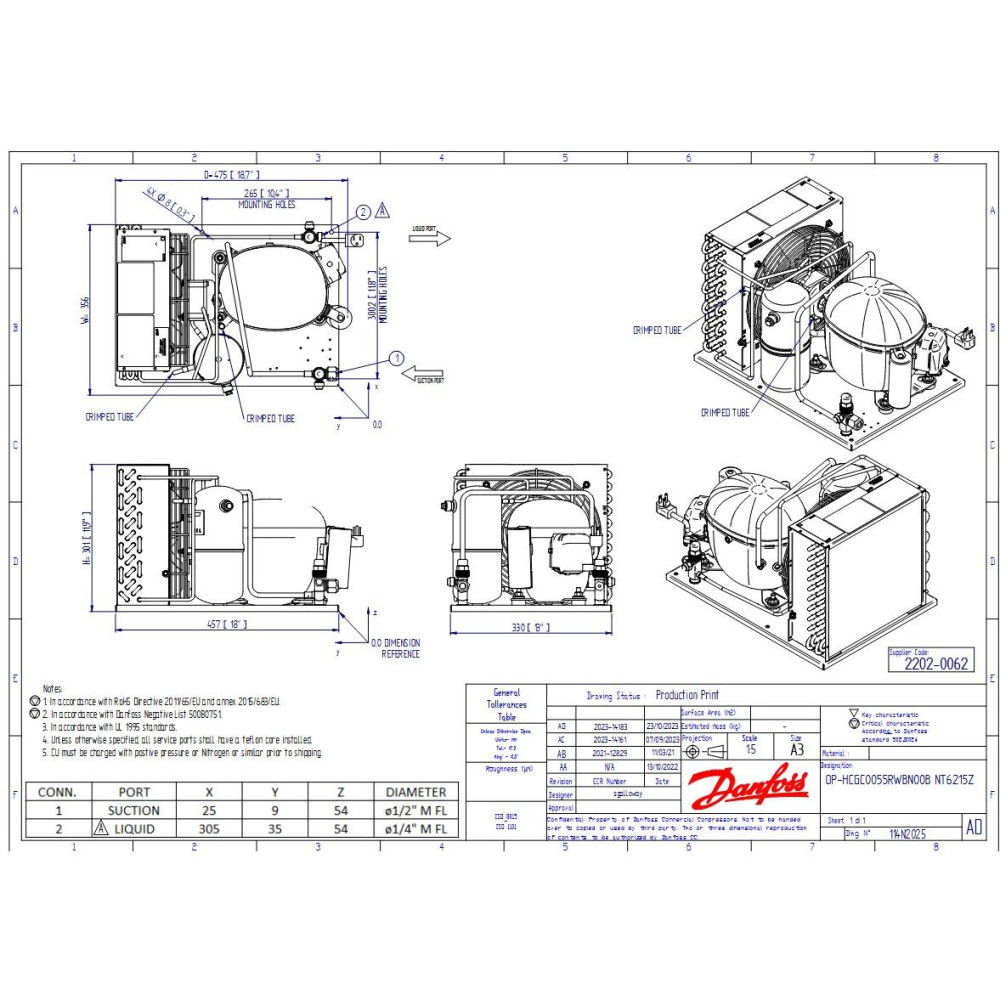 Danfoss HCGC0055RWB000B 1/2HP+, R134a Condensing Unit for Refrigeration, Copper Coil Aluminum Fins LMBP 115/1/60 (V/Ph/Hz) 1 Fan, Fractional Compressor NT6215Z, 114N2025
