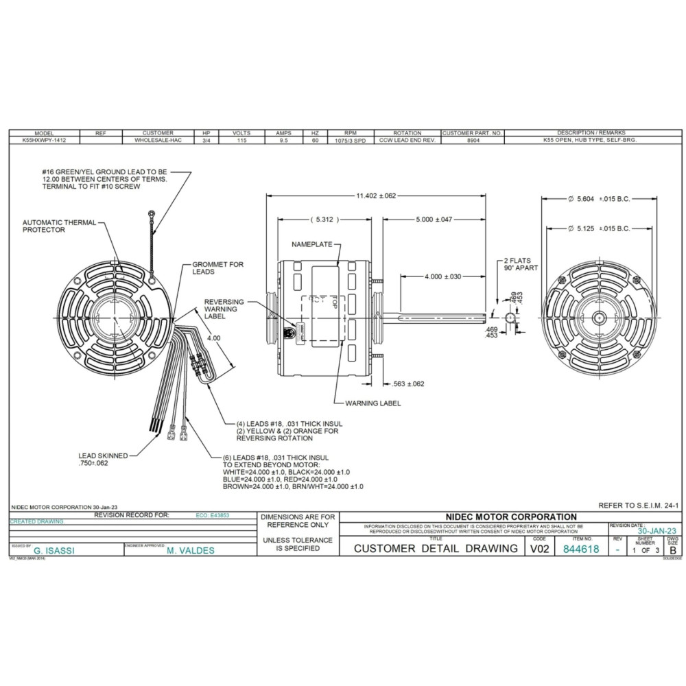 US Motors 3/4 hp 1075 rpm, 6 poles, 1 shaft, OAO Enclosure, 3 speed, 5.6 diameter, CCW, Lead End, Reversible, 115v, 60 hz, 1 ph, 15 mfd/370 VAC Run Capacitor 8904 K055WPY1412012B